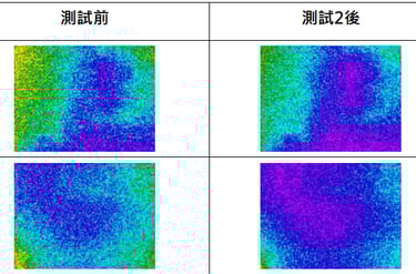 測試2(企缸防水層)後:藏水面積顯著擴大,低溫區(藍/紫色)擴散