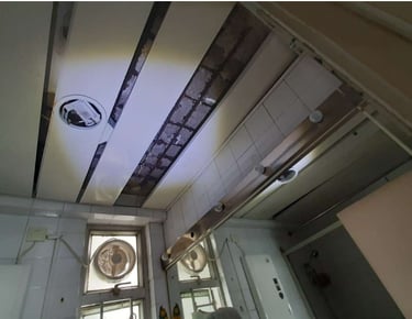 1.Emergency works: removal of damaged ceilings, rust prevention treatment, re-installation of waterproofing layer, and inspection of electrical system.
