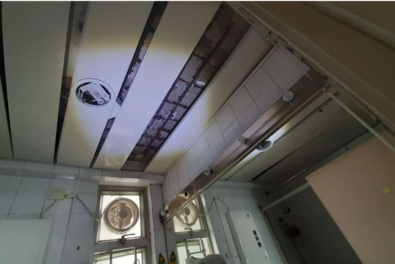 The owner of Room E on the 21st floor of Haiyi Pavilion in Riviera Gardens, Tsuen Wan, New Territories, has discovered severe leakage from the ceiling of the toilet, accompanied by concrete spalling, steel corrosion, and power outages. It is initially suspected that the cause lies in the renovation works of the upper-level unit, and the responsibility needs to be clarified.